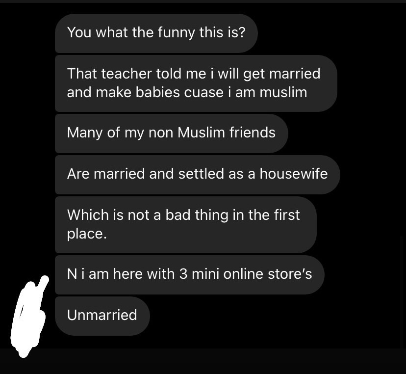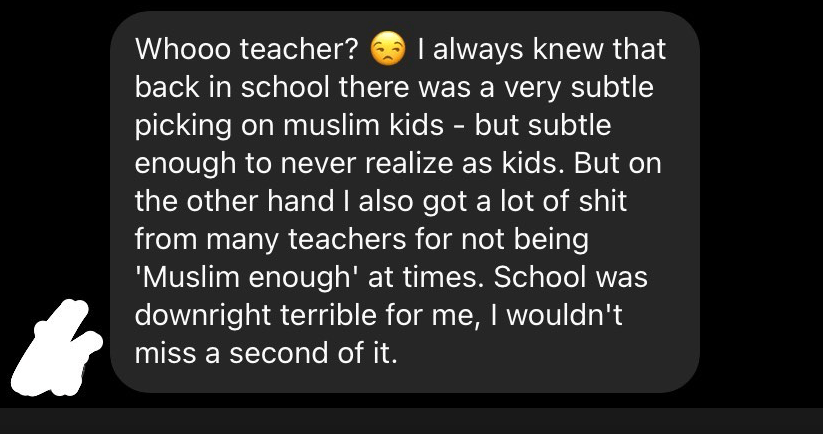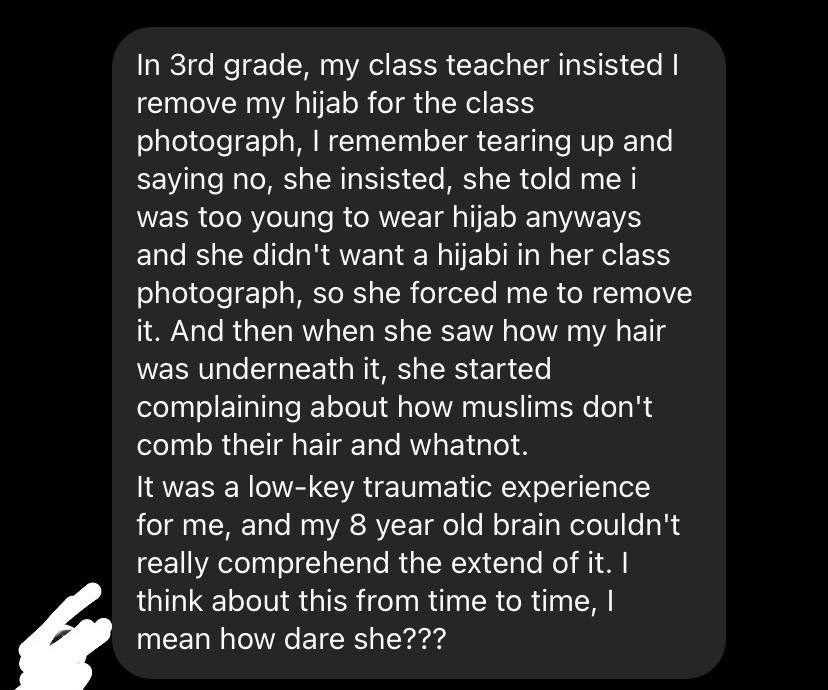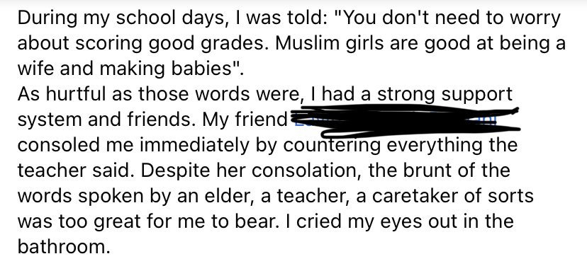 Perhaps she is as much a victim of propaganda and fake news like the rest of us. But when I posted this story on Instagram, I was shocked to hear stories of Islamophobia in our school.